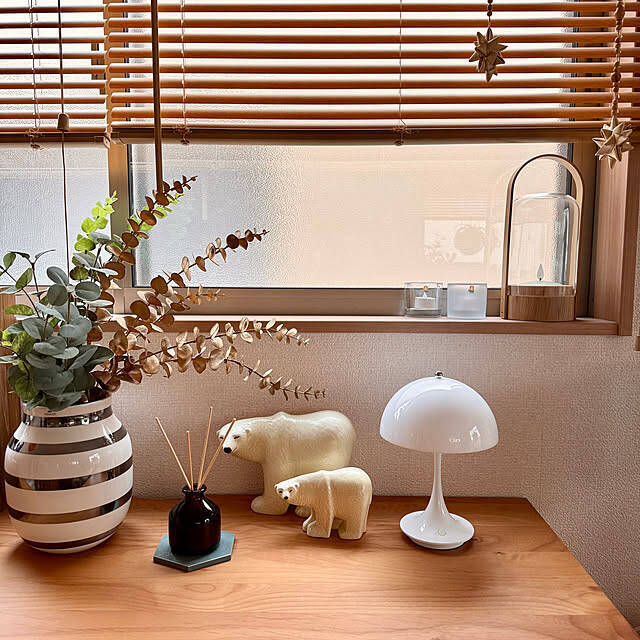 棚の上に、無印良品の水を使わないアロマディフューザーを置いているユーザーさんがこちらです。黄色みのある淡い光もリラックスした空気感を演出してくれ、周りのディスプレイともよく合いますね。のんびりとしたおうち時間が満喫できそうです。
