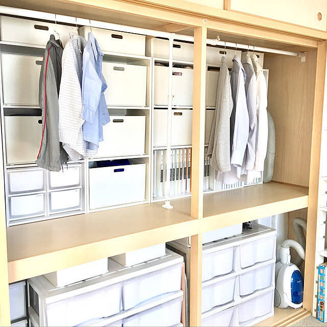 irielifeさんは、押入れの上段にニトリの「カラボ3段」を並べて置いています。押入れに合った四角い形なので、ムダなく空間を使えてお気に入りとのことです。スペース全体がホワイトで統一してあって、スッキリとした印象になっています。