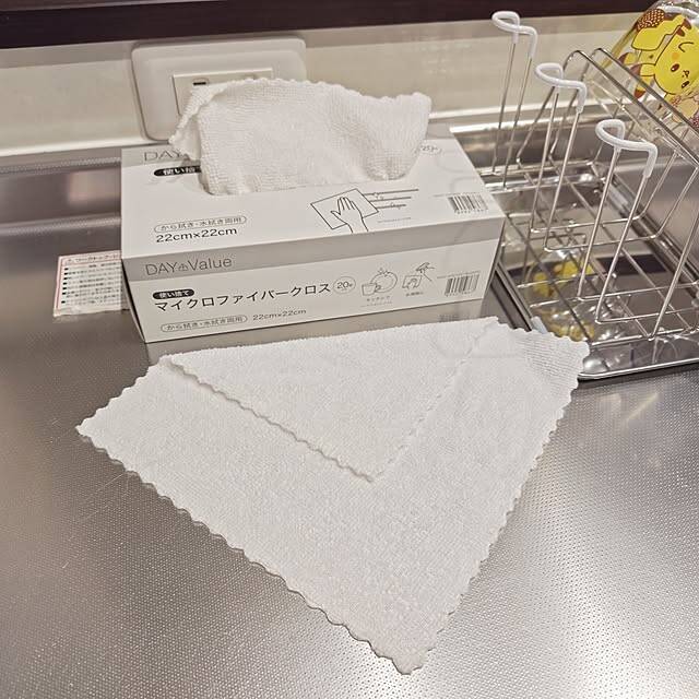 kojikojiさんが使っているのは、ニトリの「マイクロファイバークロス」です。20枚入りで399円で、ふきんに使ってからテーブルを拭き、最後は雑巾にして捨てるそう。拭き取りもよく、薄手で小さめなのでちょこっと掃除にもよさそうとのことですよ。