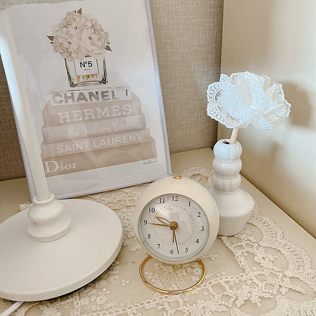 nariiiさんは、デコホームの目覚まし時計を愛用されています。コロンとしたまるいフォルムが愛らしく、ゴールド金具の脚や針がアクセントになったデザインです。雑貨と一緒に、ベッド横にディスプレイされています。色合いも統一感がありますね。