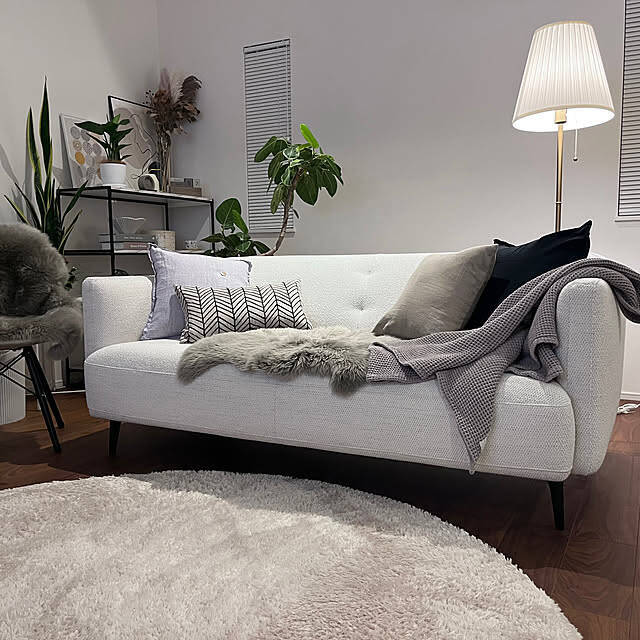 ソファまわりをくすみ系のアイテムでコーディネートされたというユーザーさん。ソファやラグは淡いグレーで、クッションやブランケットには、ウォームグレーや黒を取り入れられています。クールな中にも温かみを感じる色づかいで、モノトーンインテリアに、やさしい雰囲気が生まれていますね。