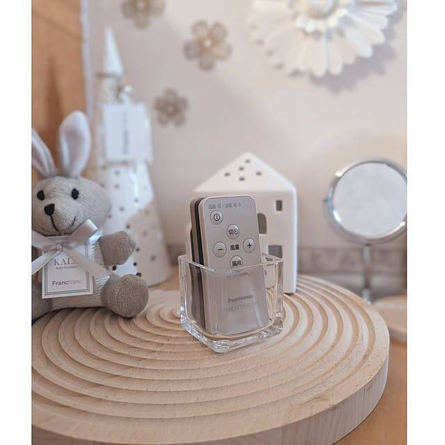 megurinさんは、小さなリモコンをセリアのガラスコンテナキューブに入れています。ガラスならではの透明感で、リモコンを入れていてもインテリア雑貨のような佇まいになるのが魅力。かわいらしい小物たちと飾るように置いても相性がよく、小さなサイズのリモコンにはぴったりのアイデアですね。
