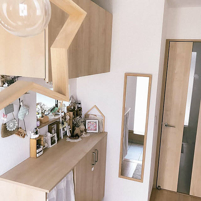 玄関の鏡をずっと探していたというsatotoさん。ニトリでぴったりのものに出会えたそうです。軽量で壁に掛けやすく、飛散防止加工が施されているので、万が一のときも安心です。出かける前にパッと確認できるのがいいそうですよ。玄関のナチュラルテイストにもぴったりなじんでいますね。