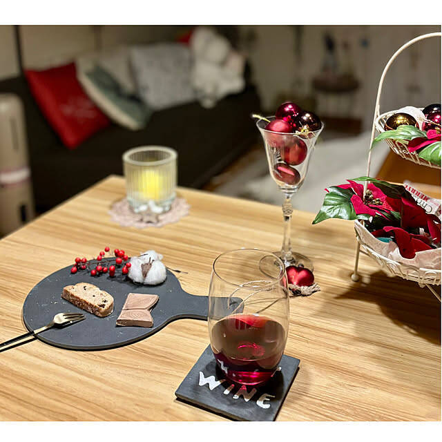 CoCo0617さんが夜のくつろぎタイムに使われているのは、ダイソーの200円の薄口ワイングラス。脚のないタイプなので、気取らず普段使いしやすいそうです。オーナメントボールを入れているグラスも、ダイソーの300円商品。プチプラながら、雰囲気のあるコーディネートが楽しめますね。