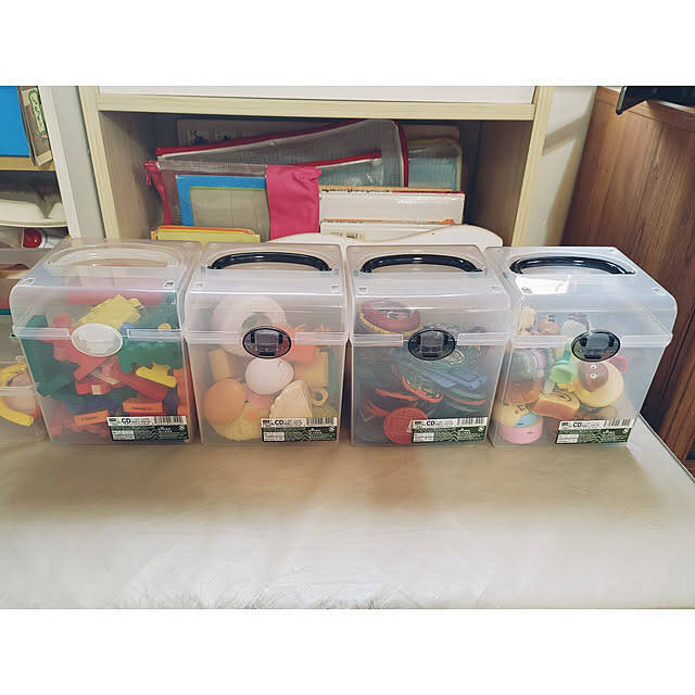 beanzさんは、細々としたおもちゃを収納するのにCDケースを活用しています。透明なので何のおもちゃが入っているのか一目瞭然で、遊びたいおもちゃを選びやすそうです。またスクエア型なら収納スペースにも収まりやすく、並べたり重ねたりと見栄え良く綺麗に整理することができます。