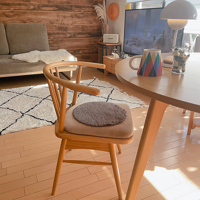 お気に入りの椅子♪ベルメゾン 曲げ木風の肘付き回転式ダイニングチェアです。ダイニングテーブルもベルメゾンなのでテーブルとチェアの高さもちょうど良く、座り心地も良いです!回転式なので立ち上がって移動するときも楽ちんで、家族もこの椅子を気に入って使っています♪