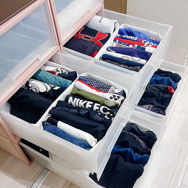 Miiさんは、不織布仕切りケースを使って、お子さんの衣類を収納していました。引き出しの中にケースを3つ入れ、手前から使用頻度の高い順に並べているんだとか。さらに、長袖や半袖ごとに分けておくことで、ケースの順番を入れ替えるだけで衣替えが完了するという、便利なアイデアです。