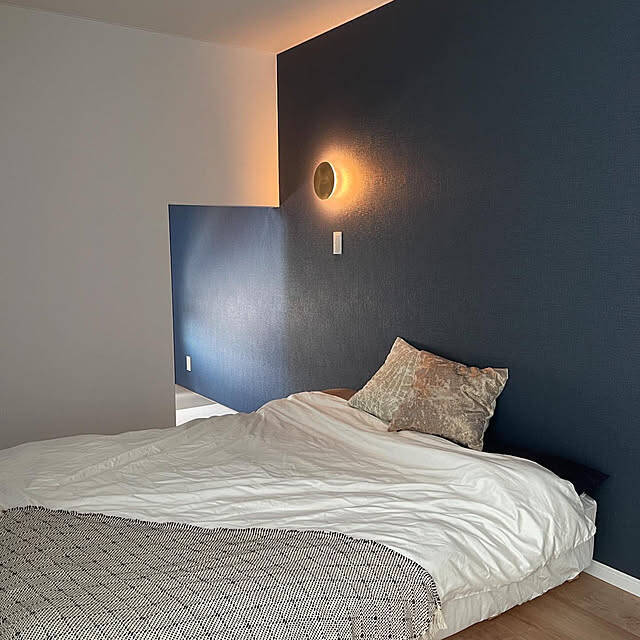 masuhome20さんの寝室は、ダークカラーのアクセントクロスにシンプルなベッドコーディネートが映える、モダンなインテリアです。掛け布団カバーは、上質な光沢と滑かな質感が魅力の「Nグリップ ホテルセレクト」をチョイス。肌触りもとてもよく、布団に入るのが楽しみなくらいお気に入りだそうですよ♡