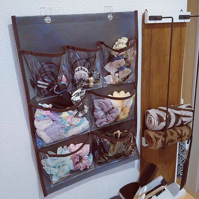 こちらの実例では、ヘアアクセサリーの収納にウォールポケットを使っています。飾りのついたゴムやシュシュなどかさばりがちなアイテムも、ポケットにぴたりと収められていていいですね。クリアカラーなので、中身も見やすいです。どのアイテムを使うか、楽しく選べそうですね。