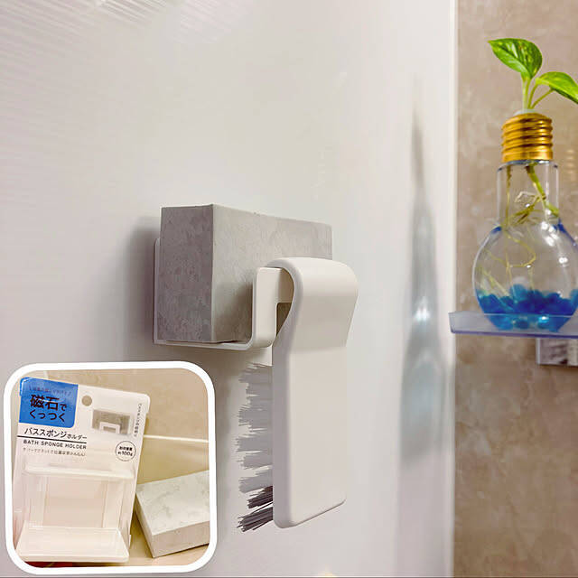 Saiiiさんは、セリアの「磁石でくっつくバススポンジホルダー」を使って、お風呂の壁にスポンジを浮かせて収納しています。フック部分にタイルブラシを掛けることで、1つのアイテムで2種類を収納できるように工夫。掃除道具がコンパクトに収まり、すっきり見えるのも◎です。