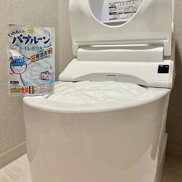 入れるだけで、便器の中全体をキレイにしてくれる「らくハピ いれるだけバブルーン トイレボウル」を紹介してくださったup0524さん。1袋を投入して1分ほど待つと、このようにすれすれまで泡が広がるんだそうです。あとは放置するだけで、汚れが落とせるという、トイレ掃除をぐっと楽にしてくれるアイテムです。