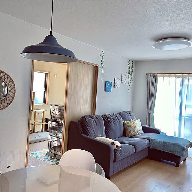 IKEAのペンダントライト「トレッティオエン」を使われている、chiiさん。シンプルなフォルムに落ち着いたブルーのシェードが、北欧らしいデザインになっています。ソファの色ともマッチして、ナチュラルなお部屋の雰囲気にもぴったりですね。