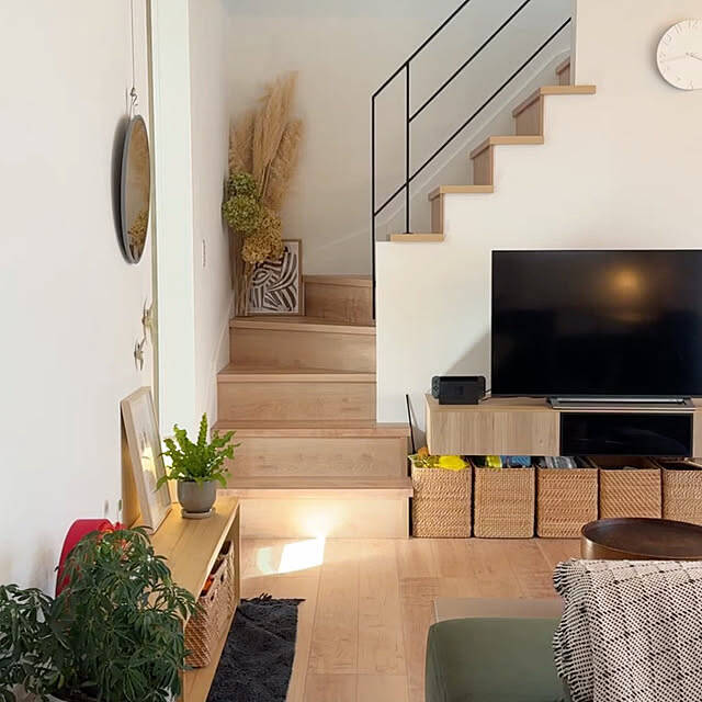 お子さんのおもちゃを、無印良品の「重なるラタン長方形バスケット」にまとめて収納しているアイデアです。大小さまざまなおもちゃも、ざっくり入れられるラタンバスケットに収めることで、日々の片付けがぐっとラクになります。おもちゃはどうしても増えがちですが、見た目のごちゃつきを抑えつつ、お子さん自身も出し入れしやすい定位置をつくる発想は、真似したくなるポイントです。インテリアの雰囲気に馴染むナチュラルな素材感を選んでいるところも、空間全体のやさしい雰囲気を大切にされていることが感じられますね♪