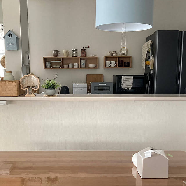 建売住宅のキッチンを、自分らしい空間へと整えられているchunpinaさん。食器棚を思い切って手放し、無印良品の「壁に付けられる家具」を取り入れることで、キッチン全体をすっきりと見せながら使いやすさも確保されています。カフェの雰囲気を取り入れつつ、日々の動線や使いやすさを大切にされている姿勢が印象的ですね。