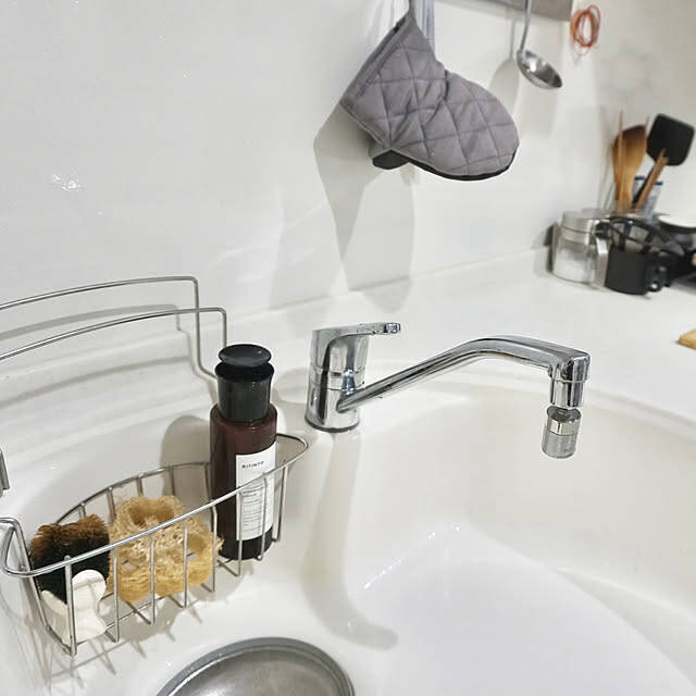 キッチンのシンクでスポンジのかわりにタワシを使っているという、eepさん。スポンジ置き場には、3COINSのプッシュ式ボトルも並んでいます。洗剤が出しやすいプッシュ式ボトルで、洗い物もスムーズにできそうですね。