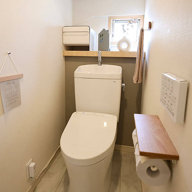 我が家のトイレインテリアです。 広さは0.75坪あり車椅子のままでも入れるようになっています。 ほか、足触りが優しくクッション性のあるコルクタイルを敷いています! サラサラとした足触りで、素足でも冷たくないです。