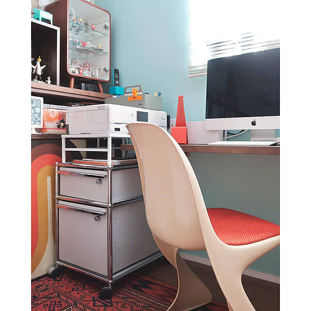 USMハラーのキャスター付きワゴン「ロールボーイ」をデスク横に置かれている、NK67さん。ワゴンにはtowerの食洗機ラックを置いて、プリンター置き場にされています。ラックを組み合わせることで、高さを上げることができ収納スペースも増しますね。
