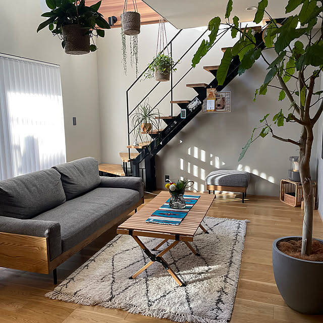 Y33355さん宅のリビングには、普段テーブルはありません。でも来客の多いときなどには、ハイランダーの「ウッドロールトップテーブル」が登場します。キャンプチェアに合わせて少し高めになっているから、ソファとの相性も抜群なのだそうですよ。すっきりとナチュラルなインテリアにもとてもよく馴染んでいます。