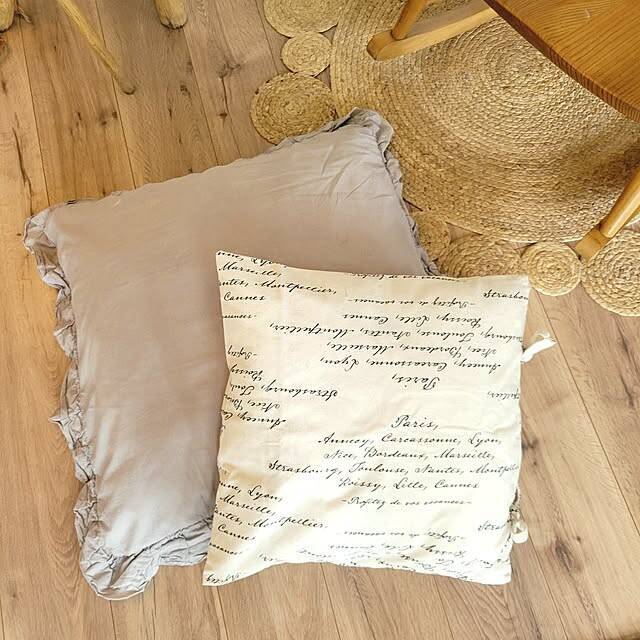「抱っこしたくなるふわふわな肌触り」とpinonさんがおすすめしてくださった2種類のカバー。どちらも200円商品だったんだそうです。素材感はどちらも違いますが、合わせて使うとほっこり感が倍増して、癒しの空間になりますね。ファスナーも付いているので、クッションの入れ替えもしやすそうです。