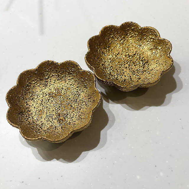 aya.kurashi1128さんがセリアで発見されたのは、ゴールドの豆皿です。おそろいで2皿購入されました。縁がお花のようなデザインで、とてもゴージャスな印象です。お祝いやイベントシーンにも使えそうですね!