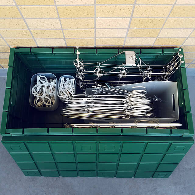 pyons_0105さんは、洗濯アイテムをまとめてコンテナボックスに収納されていました。ハンガーはさらにファイルボックスに入れて取り出しやすくされていますね。また、こちらのコンテナボックスはフタ付きで、ベンチとしても使えるそう。ちょっと腰掛けて休憩することもでき、一石二鳥ですね♪