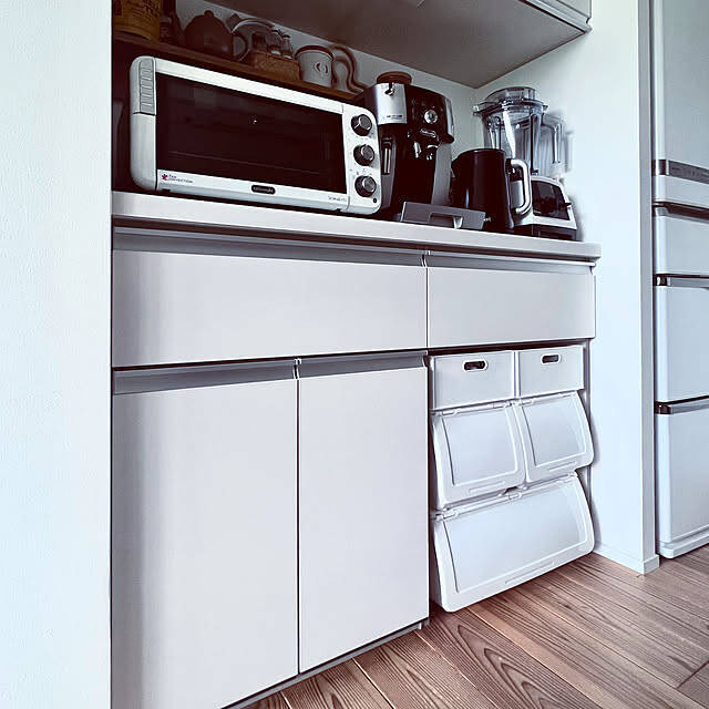 我が家のゴミ箱キッチン背面に、跳ねあげ式のNフラッテとNインボックスを組み合わせて、缶瓶古紙などに分けています。Nインボックスはスライドして引き出しとして使っています!