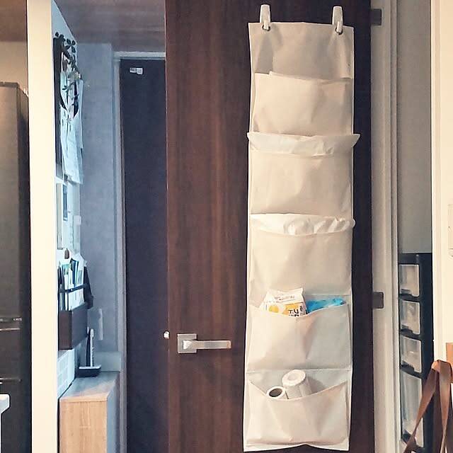 yuuさんはウォールポケットを使い、ゴミ袋をサイズ別に収納していました。納戸の扉裏にコマンドフックで吊るしているため場所を取らず、省スペースで収まるのがうれしいポイント。扉を閉めれば中が見えないので見た目もすっきり。開けたらすぐ取り出せて、使い勝手のよさも両立しています。