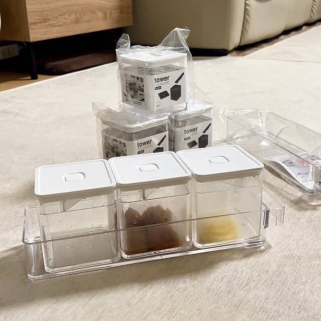 puritan_rさんは、山崎実業towerシリーズの密閉容器を活用されています。トングが付いていて、ネギや薬味を入れるのに◎。パール金属のスキットトレーに、密閉容器3個がぴったりだそうです。冷蔵庫内がスッキリする上に、取り出しやすくて一石二鳥ですね!