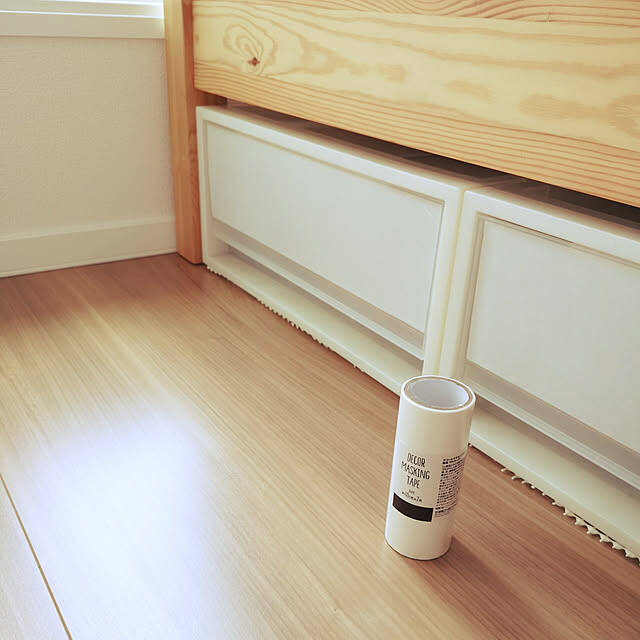 セリアのマスキングテープで衣装ケースを目隠ししているmachakoさんの実例です。ケースの枠と色味をそろえることで、ベッド下のスペースもスッキリと洗練された印象になりますね。