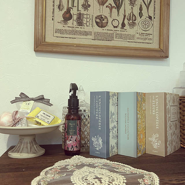 na-naさん宅の脱衣所では、入浴剤や洗濯バサミなどをブック型のケースに入れ、まるでディスプレイかのような収納が完成しています。アンティーク風なデザインがお部屋の雰囲気とも相性抜群です。それぞれデザイン違いのものを並べることで中身を区別しやすく、使いたいものをすぐ手に取ることができますね。