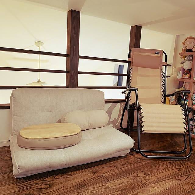 ロフトにソファやキャンプ用のチェアを置いて、くつろぎスペースにされているkumijiさん。ニトリのソファは、マットレスのように広げることができリクライニング機能付きです。ローソファなので、圧迫感もありませんね。ひとり時間をゆったりと過ごせます。