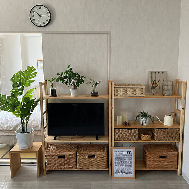 yukinoさんは、パイン材ユニットシェルフをテレビボードとして使っています。棚板の高さや数をカスタマイズできるので、テレビのサイズにも無駄なくフィットしてくれますね。グリーンをディスプレイして、リラックス感のあるインテリアに。カゴを使って、生活感をカバーするテクニックも参考になります。