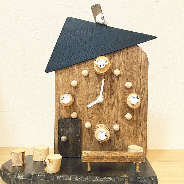 時計キットと端材を利用して、こちらの時計を手作りされたkeep_patienceです。お家からシマエナガが顔をのぞかせているようなデザインに、見ているだけでもほっこり癒されますね。余っている端材や家に眠っている素材など、どんなものでも材料として取り入れられるのもうれしいポイントです。