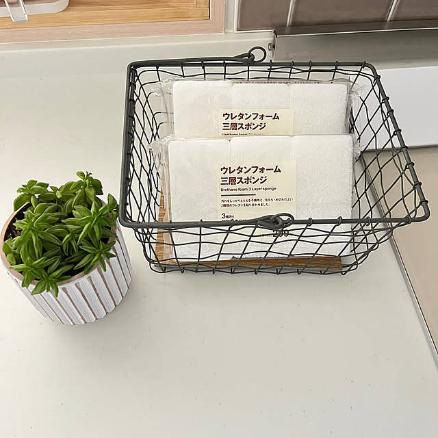 natsumiさんがキッチンの洗い物に愛用しているのは、無印良品の「ウレタンフォーム三層スポンジ」です。白色で汚れや消耗の状態がひと目で分かりやすく、泡立ちのよさもお気に入りとのこと。使い終えたあとは半分にカットしてお掃除用に再利用しており、無駄のない使い方も参考になります。