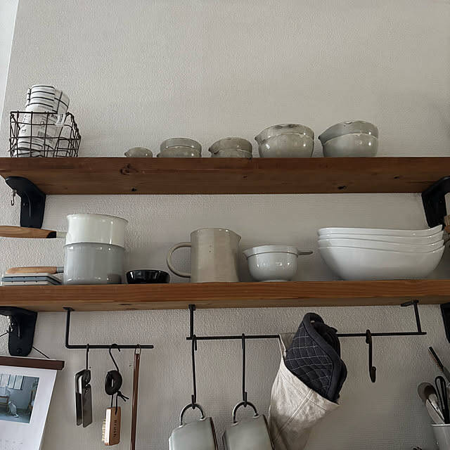 moana_no_ieさんのように、ウォールシェルフにセリアのアイアンバーを組み合わせれば、シンプルな棚がさらに使いやすくなります。フックで吊るす収納は、カップや小物類の整理に便利ですよ。お気に入りの食器をインテリアとして楽しみたい方にぴったりなキッチン収納ですね。