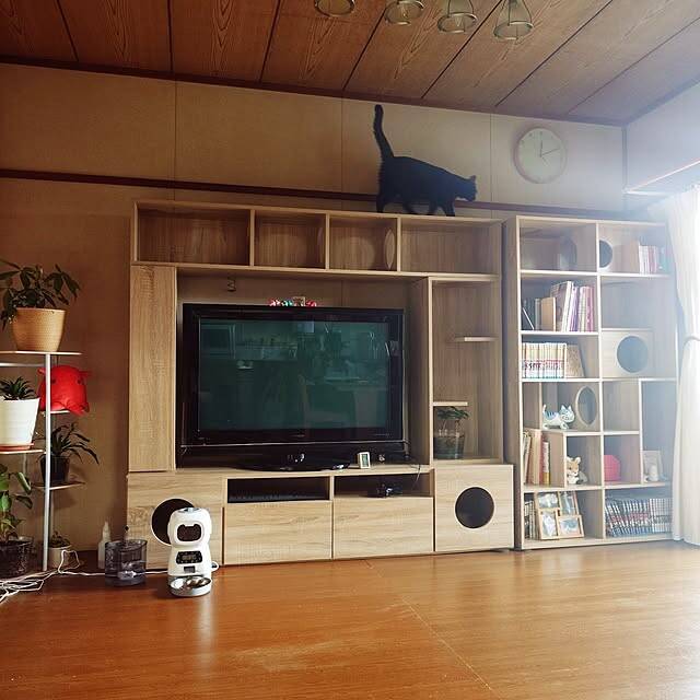 大きなキャットタワー付きの本棚とテレビボードを購入されたbutterflykissさんの実例です。ナチュラルなカラーの家具はインテリアなじみも良いですね。似ているデザインのものを並べると、統一感のある空間が手に入ります。