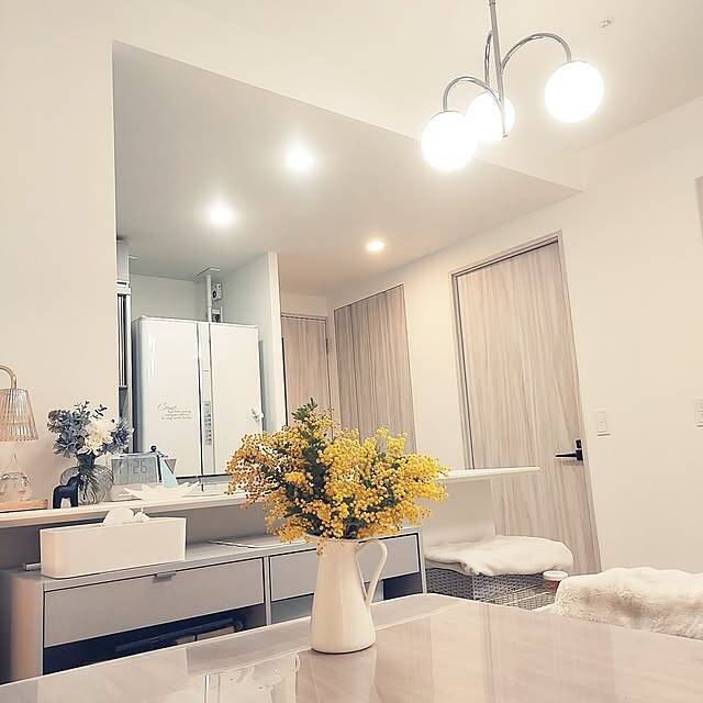 wisteriaさん「狭小マンションのため、できるだけ空間を広く感じられるように、白を基調にしています。ガラスボールの照明はIKEA。広くないお部屋のなかで、存在感ありますが、まるっこいのが可愛いです。壁の隅に間接照明を置きました。こちらもIKEA。