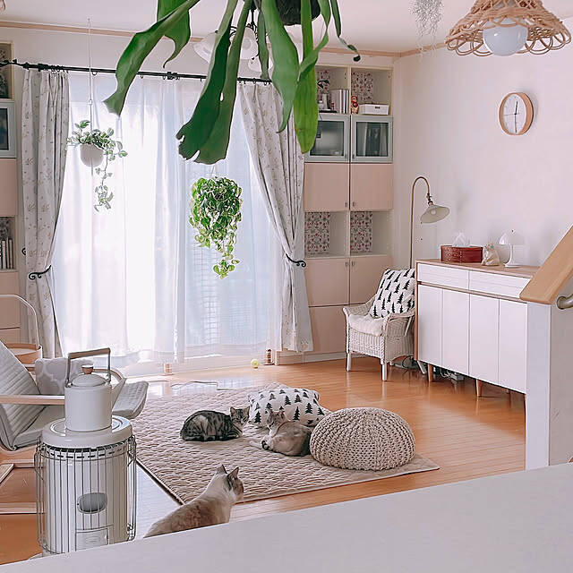milkcocoaさんの暮らしは、白を基調としたナチュラルな北欧スタイル。お部屋に一歩足を踏み入れると、柔らかな光と瑞々しいグリーン、そしてのびのびと寛ぐ猫ちゃんたちが温かく迎えてくれます。ホワイトの清潔感に木目の温かみをバランスよく加え、日常の風景を丁寧に整える。そんなmilkcocoaさんの自然体な暮らしのスタンスが、空間全体に心地よい安心感と、凛とした清潔感を生み出しています。