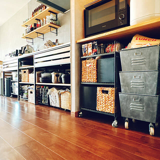 tamisumiaさんは、キッチン下に置いているかごやバスケットに100均のキャスターを取り付けていました。ほこりが溜まりやすいオープン収納では、物を動かしやすいように工夫しておくことで、お掃除もスムーズにこなせます。隠すと見せるをバランスよく取り入れた、使い勝手のよさそうなキッチン収納ですね。