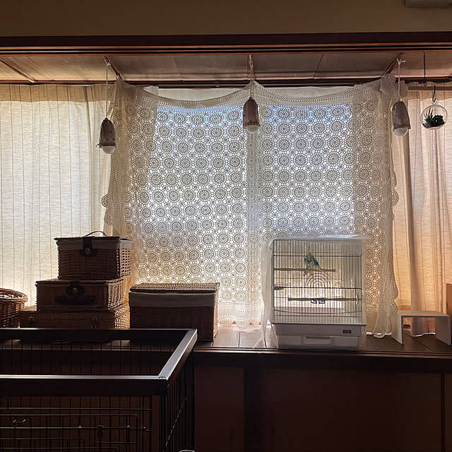 hanaさんのリビングでは、テーブルクロスをカーテン代わりに使っていました。日よけとして役立つのはもちろん、透け感のあるレースが大人かわいい雰囲気を演出してくれます。控えめながらも繊細なデザインは、さりげないお部屋のアクセントとして活躍してくれますよ。