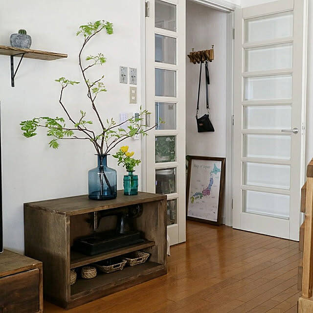 fumi_3さんはリビングにアンティーク感のある棚を設置しています。こちらの棚はなんと手作りとのこと♪古材のような味わいのある仕上がりで、空間にやさしくなじんでいます。爽やかなブルーのフラワーベースやグリーンも引き立ち、ナチュラルな彩りを添えていますね。