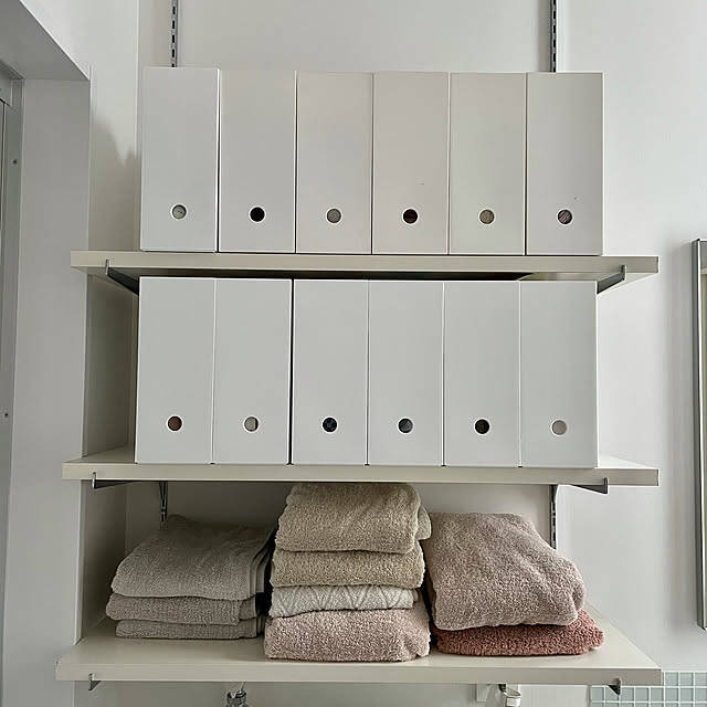洗濯機の上に棚を設置されている、Kaneyukiさん。ニトリのファイルボックスを並べて、整理整頓されています。空いたスペースを有効活用した収納は、見た目にもすっきりとして使い勝手が良さそうですね。ホワイトで統一されて、清潔感もバツグンです。