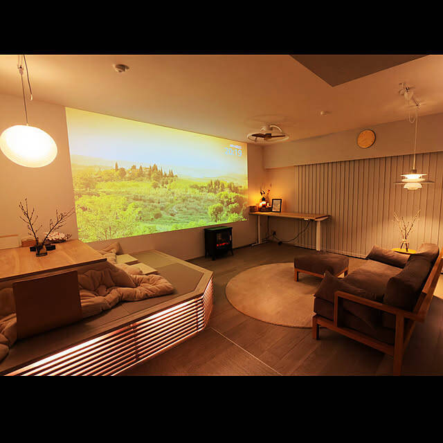 piroaiさんの住まいでまず目を引くのは、マンションリノベの枠を飛び越えた、遊び心あふれる設備です。特筆すべきは、本格的なプライベートサウナ。自分のペースで心ゆくまで「整う」時間は、何にも代えがたい贅沢ですね。さらにリビングには、壁一面をスクリーンにした約170インチの巨大シアターも。サウナで汗を流したあと、大画面で映画を観ながらソファで寛ぐ――。自分の「好き」を最優先したからこそ生まれた、最高にリラックスできるルーティンがここにはあります。