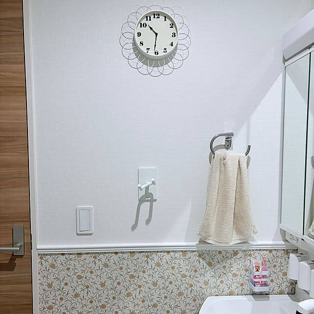 隙間時間に少しずつDIYをしています。何もない真っ白な洗面所の壁を変えました。下半分にモリスのマスキングテープ、壁紙との境目にモールディング、壁に掛けてあるのはIKEAのお花の時計です。