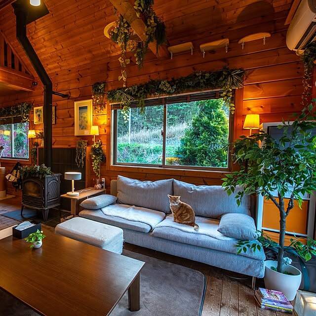 T.R.D.LABOさん「我が家のリビングは明かりとグリーンに囲まれた憩いの場をテーマにしています♪グリーン率を上げると、気持ちがゆったり落ち着きます。お気に入りの間接照明でさらに雰囲気をUPです。」