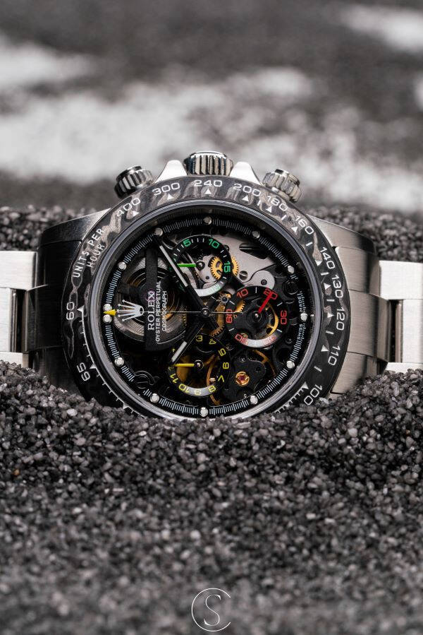 元カメルーン代表のサッカー選手であり、時計愛好家である「サミュエル エトオ」とコラボレーションして生まれたモデル。彼のデザインに従って、SKELTON CONCEPTによってカスタマイズされたデイトナは、カーボンベゼルとスケルトンダイヤルを組み合わせた独創的なデザインとなりました。