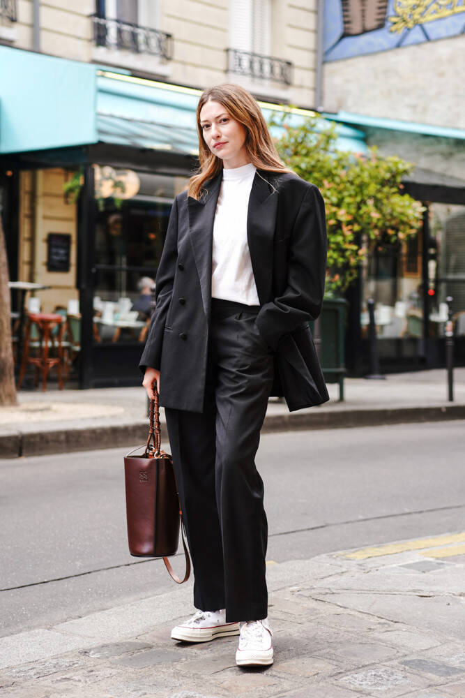 パリの人気コンセプトストア、トム・グレイハウンド(TOM GREYHOUND)のメンズ・ウィメンズのバイヤーを務めるモードを熟知した彼女が選んだのは、メンズライクなスクエアショルダーのオーバーサイズテイラード。黒のセットアップに無地の白Tシャツと白スニーカーでカジュアルダウンさせて、潔いモノトーンのスタイリング。さらにメイクはリップのみと極力ナチュラルにすれば、全体的にクドくならない。