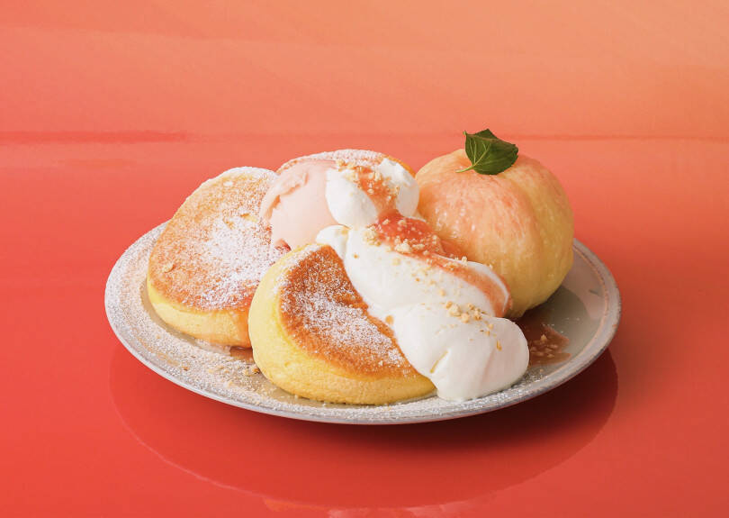ふわふわに焼き上げたパンケーキに、旬の瑞々しい山梨県産の白桃を丸ごと1個贅沢に添え、白桃と桃のジュレ、白桃ソルベをトッピングした白桃づくしのパンケーキ。