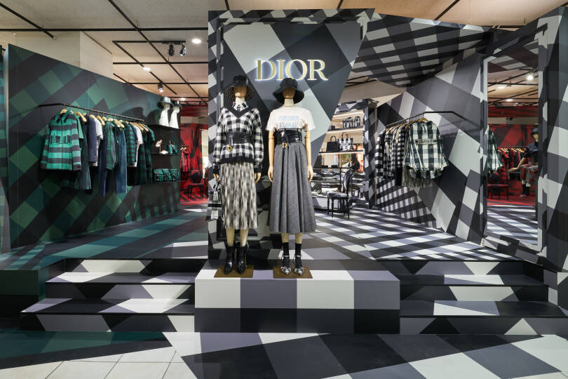 今回のポップアップでは、伊勢丹新宿店本館館内の1階から6階まで様々なスポットがディオールのチェック柄で彩られている。新木さんは、「私は特にエスカレーターに感動しました」と、チェック柄のグラフィックに染まったエスカレータについてを紹介した。