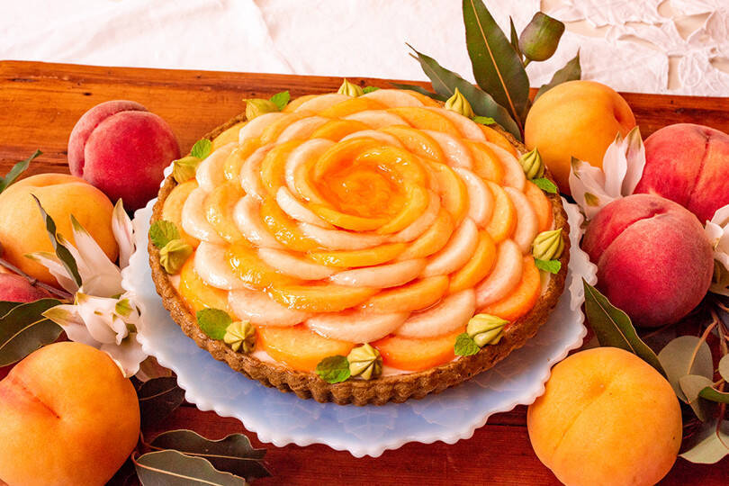 9月中旬まで展開される「2 色の桃とはちみつヨーグルトムースのタルト」(ピース 税込651円 / ホール 税込6,512円)は、同店のコンペで1位に輝いた、仙台店のスタッフが考案したタルト。